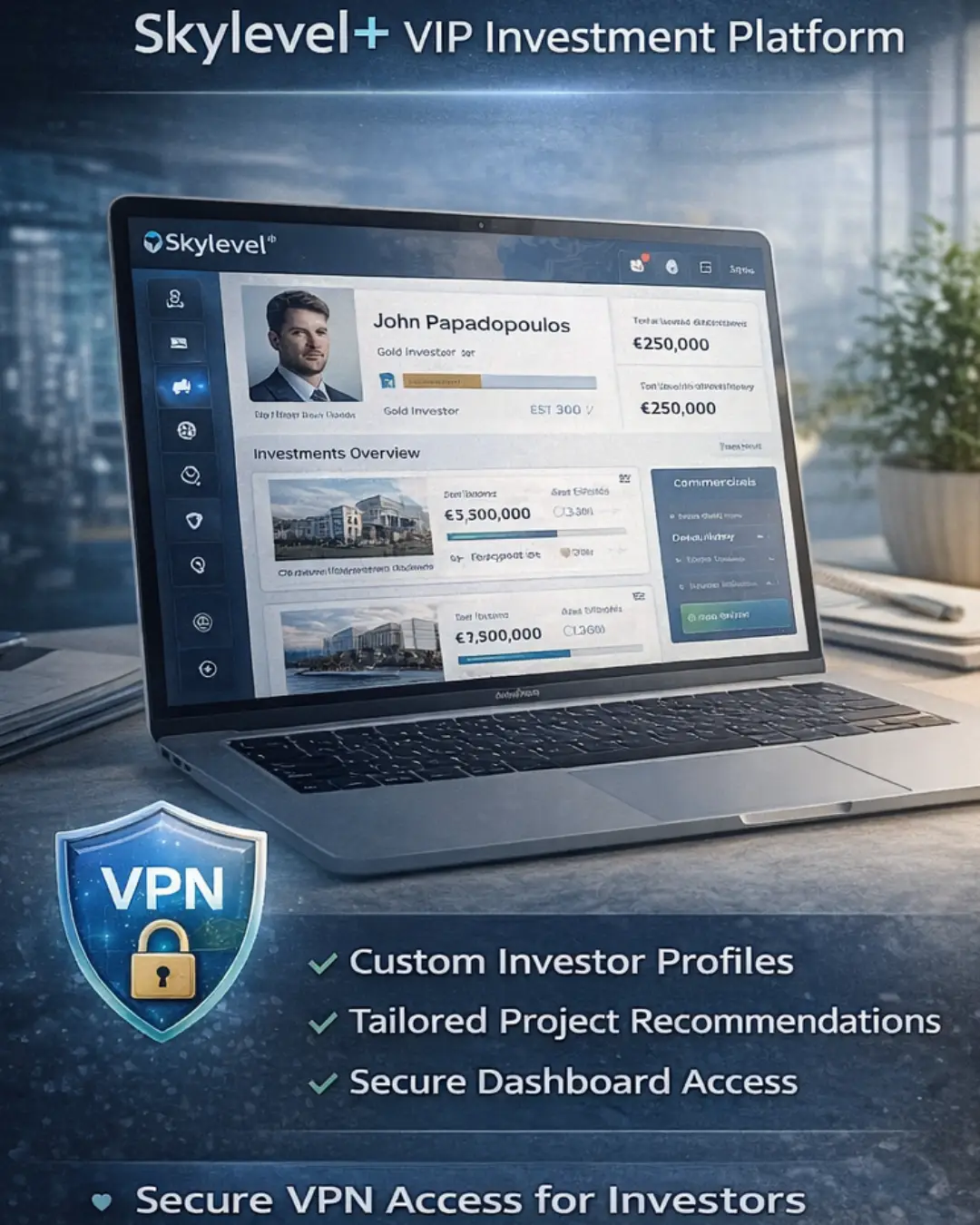 Skylevel+ Platform: Secure VIP portal with VPN access for investors, custom dashboards, and project recommendations.